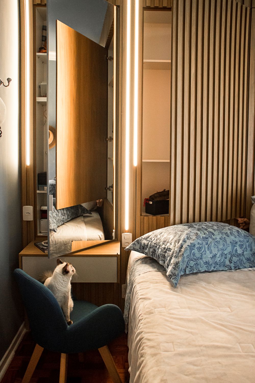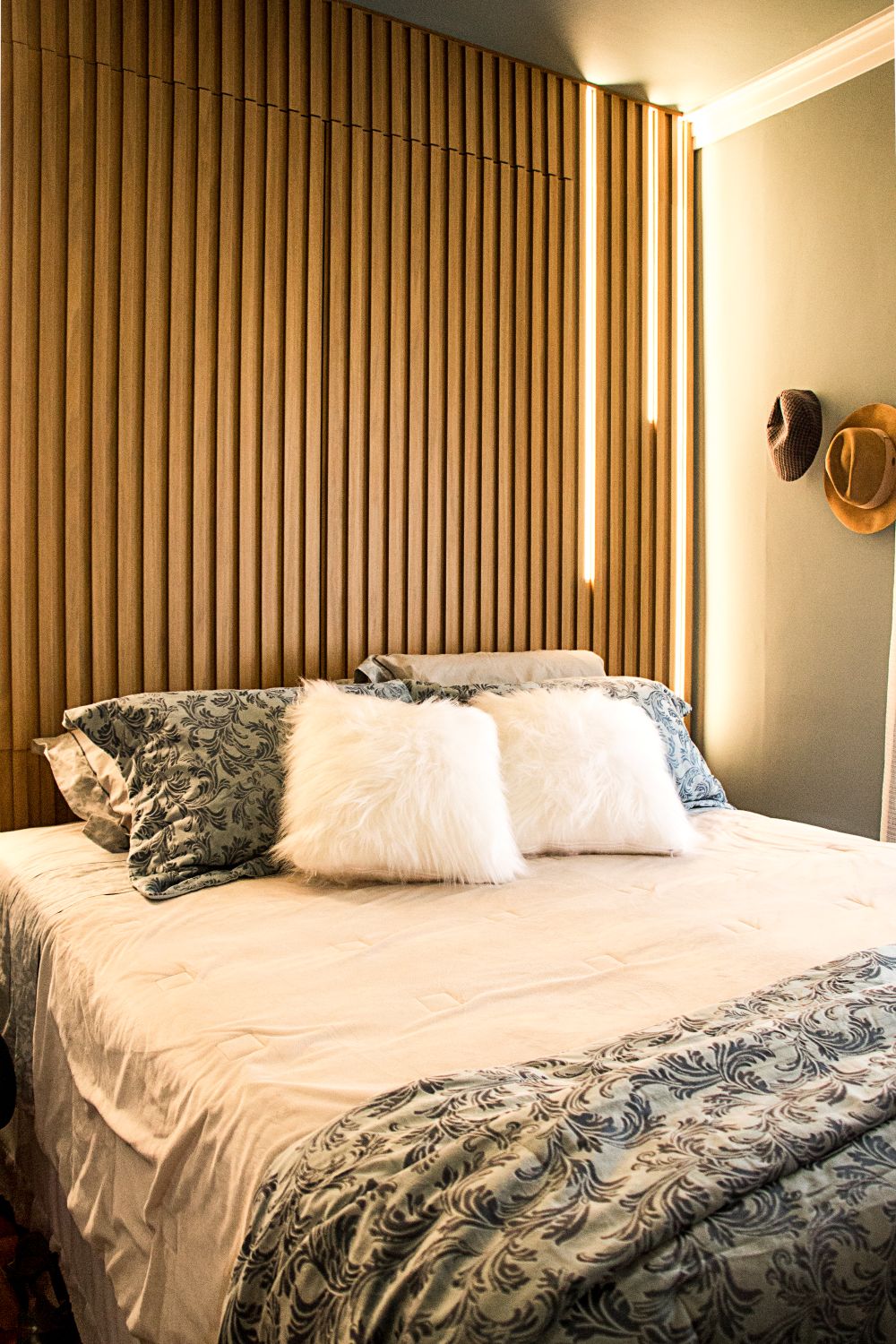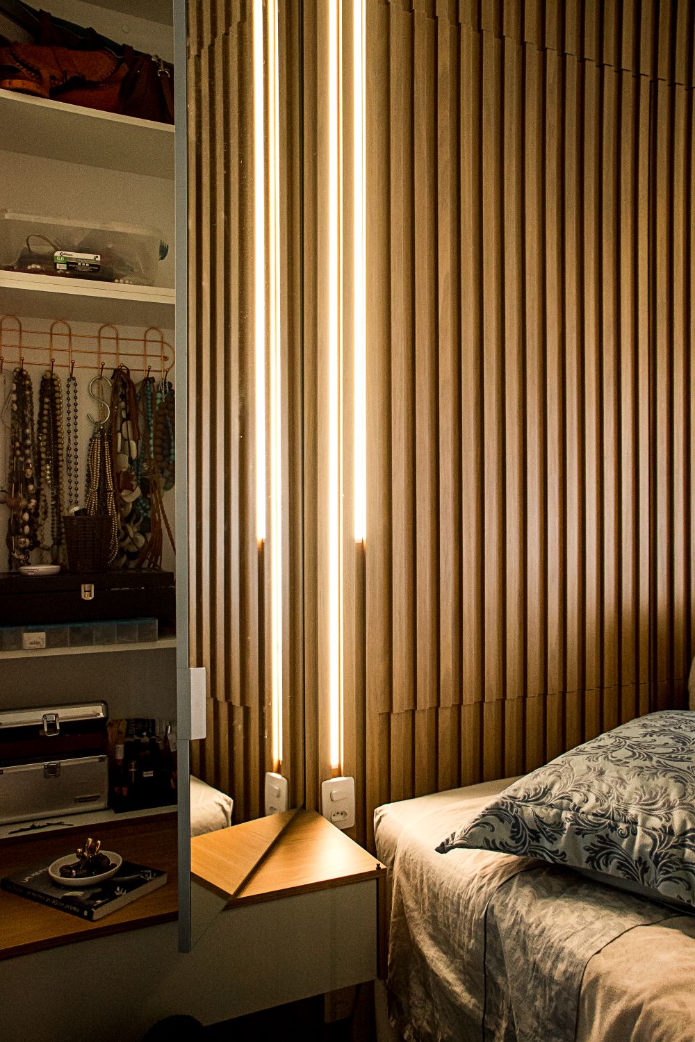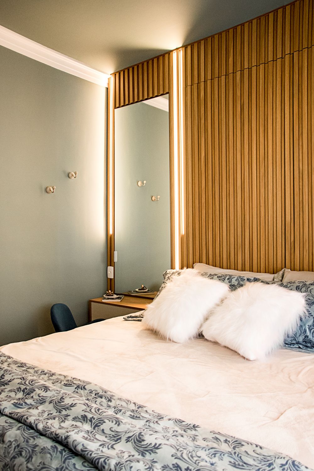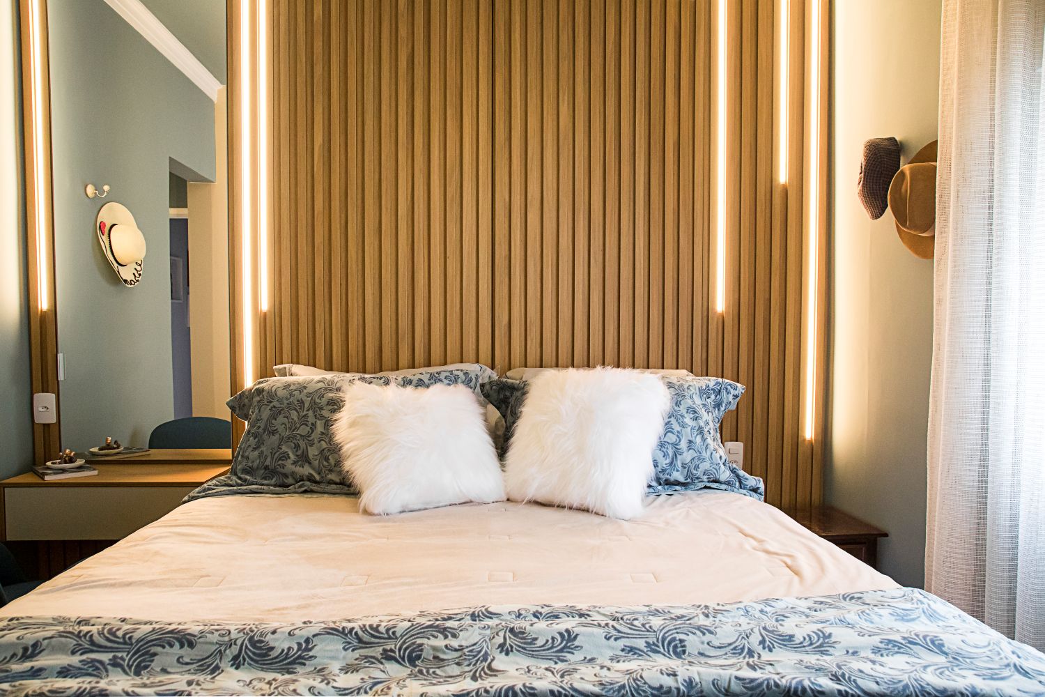 Já no quarto do casal, o painel ripado da cabeceira esconde armários ocultos, otimizando o espaço com elegância e praticidade.