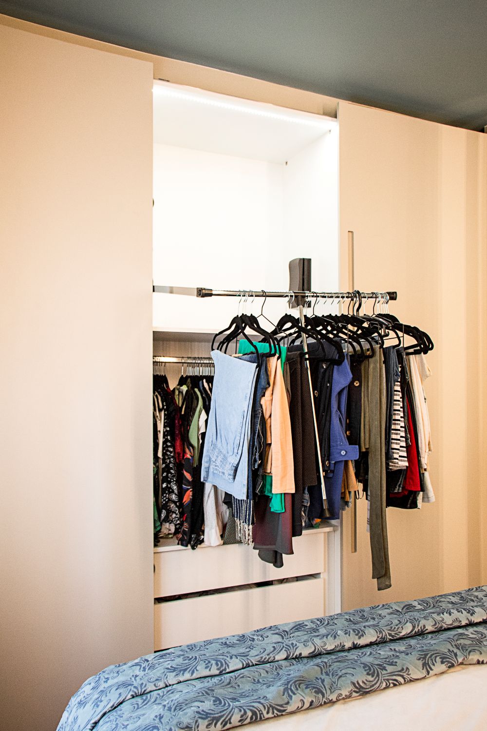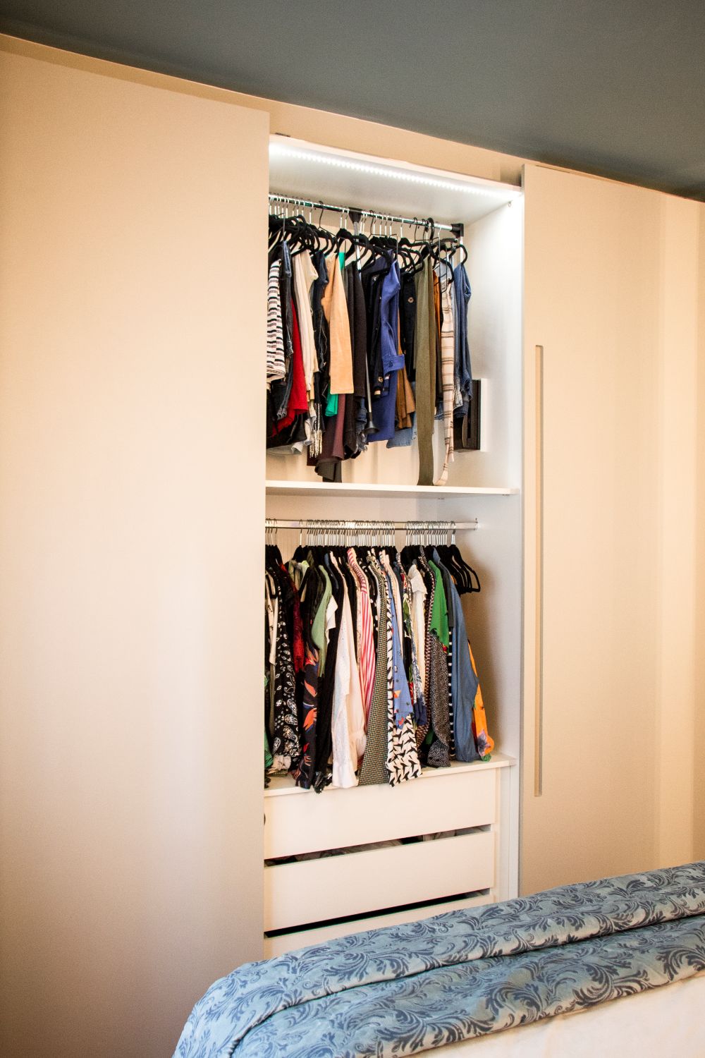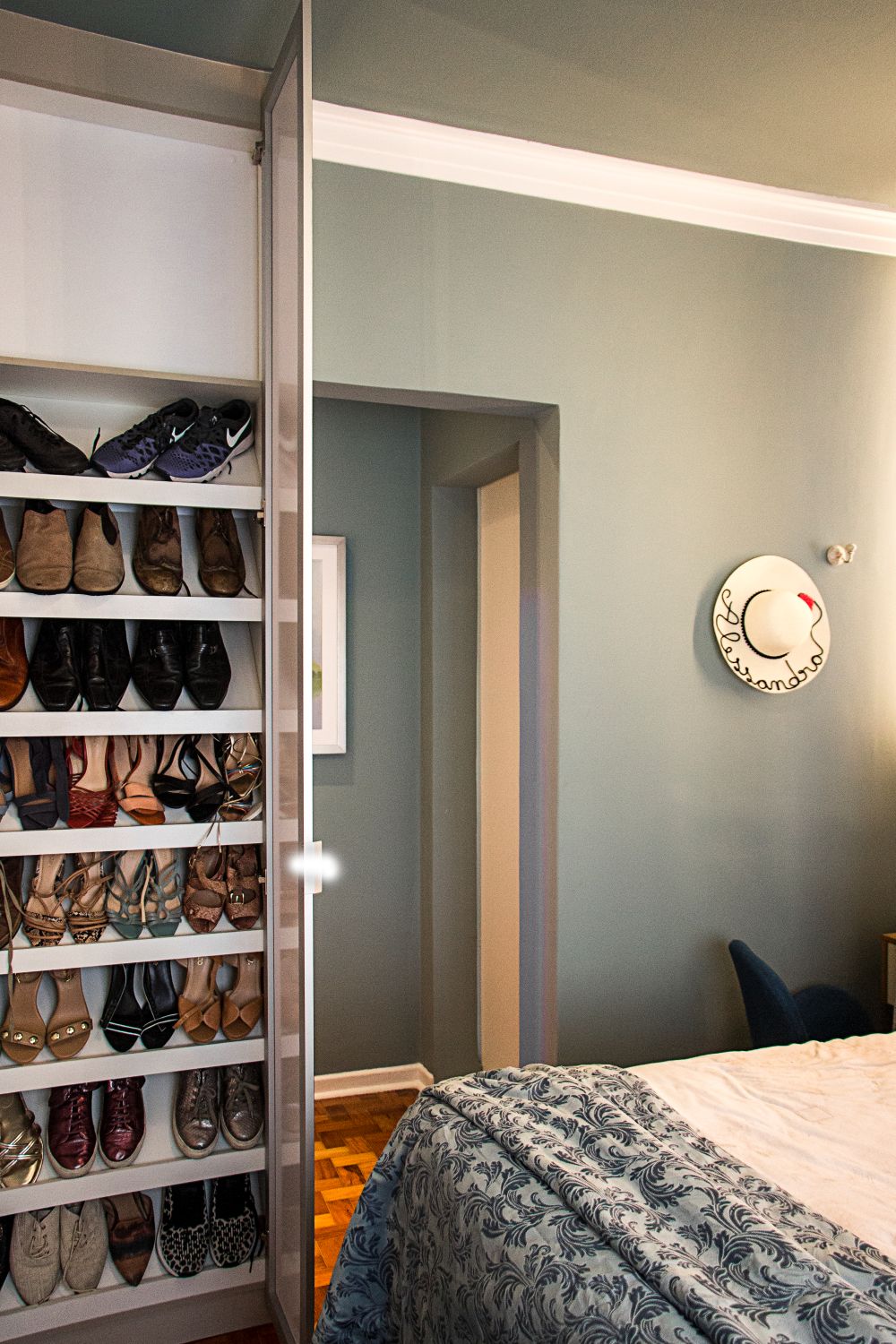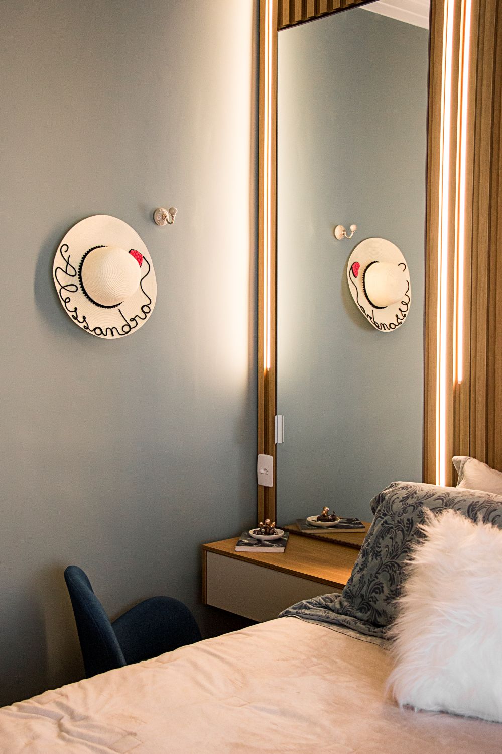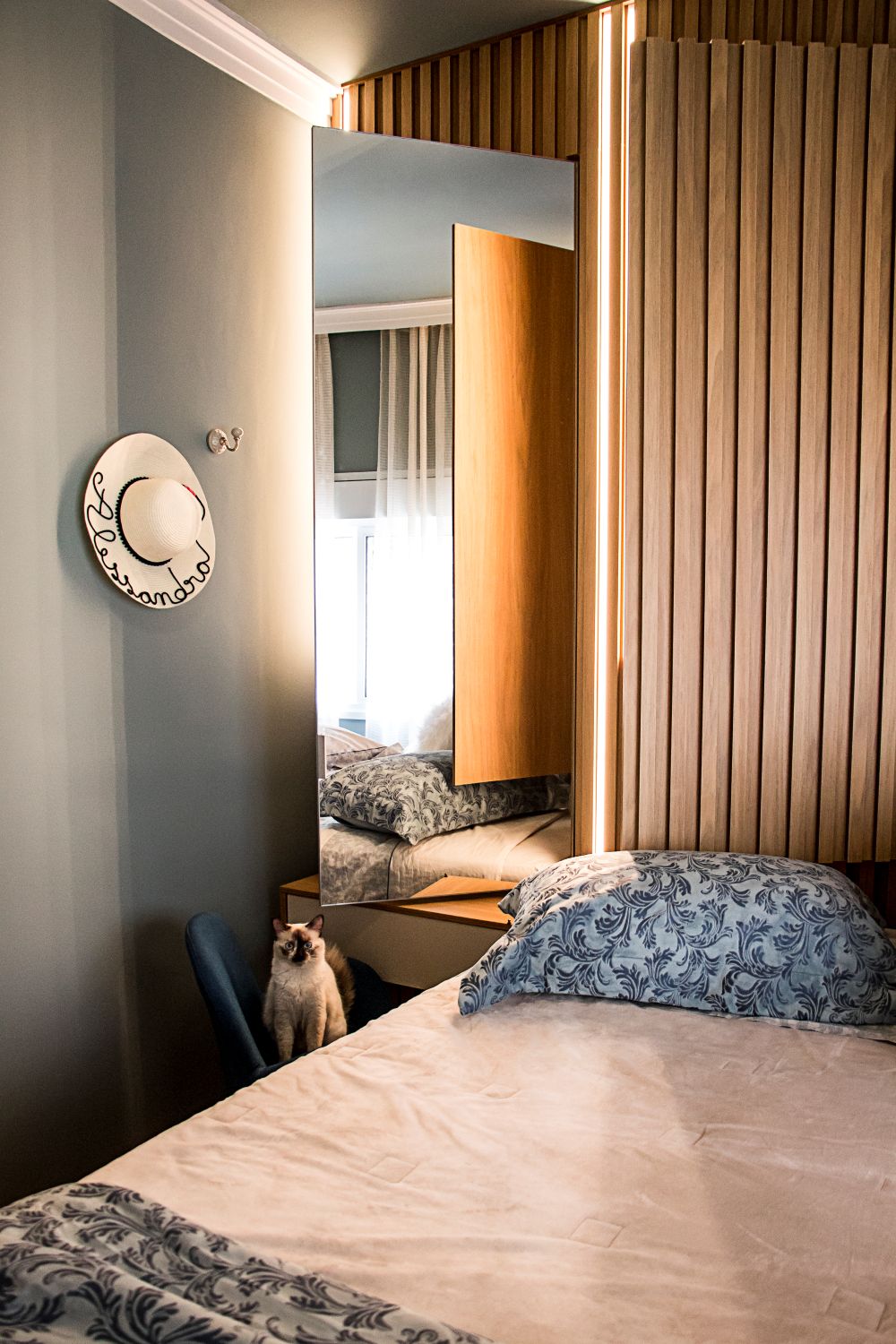 Já no quarto do casal, o painel ripado da cabeceira esconde armários ocultos, otimizando o espaço com elegância e praticidade.
