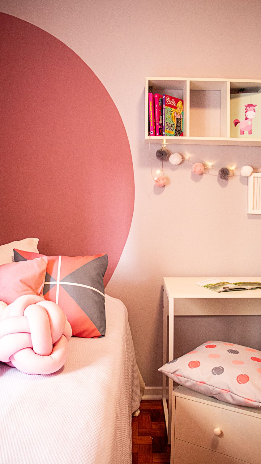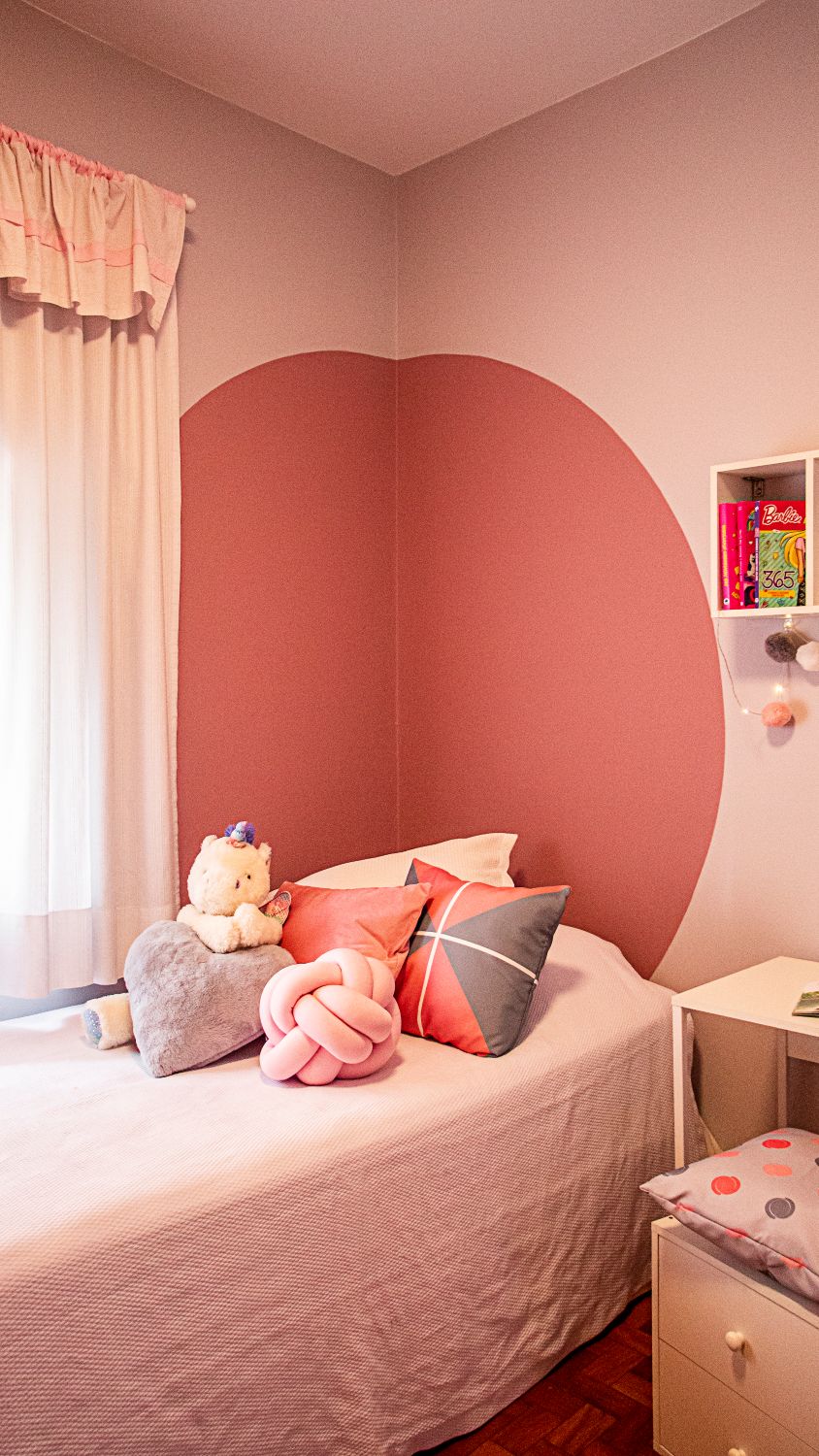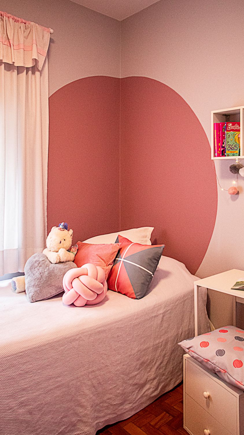 O quarto da menina traz cores claras e uma pintura na parede que substitui a cabeceira tradicional, criando um ambiente leve e delicado.