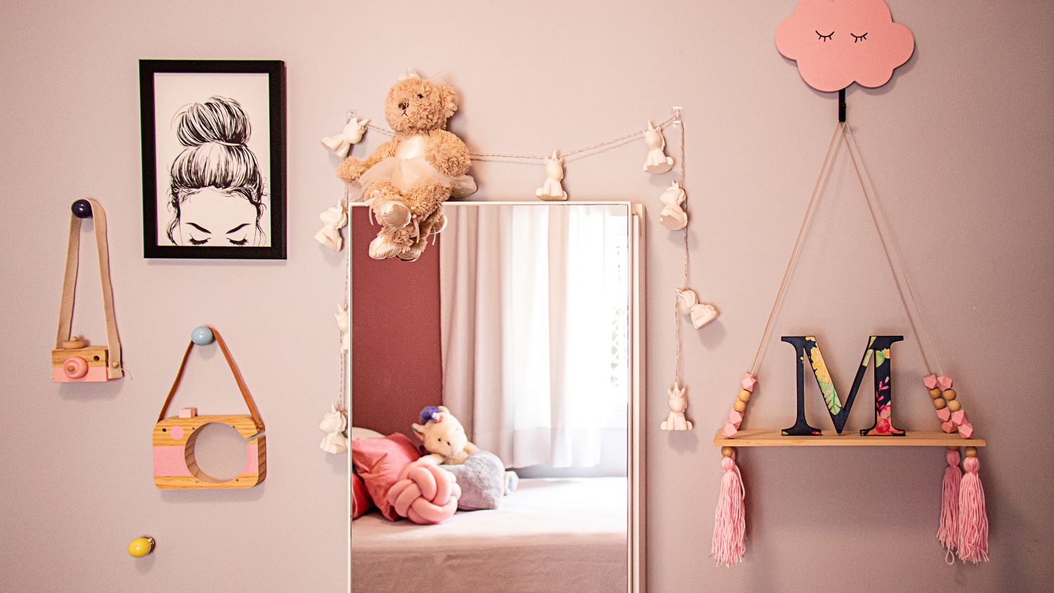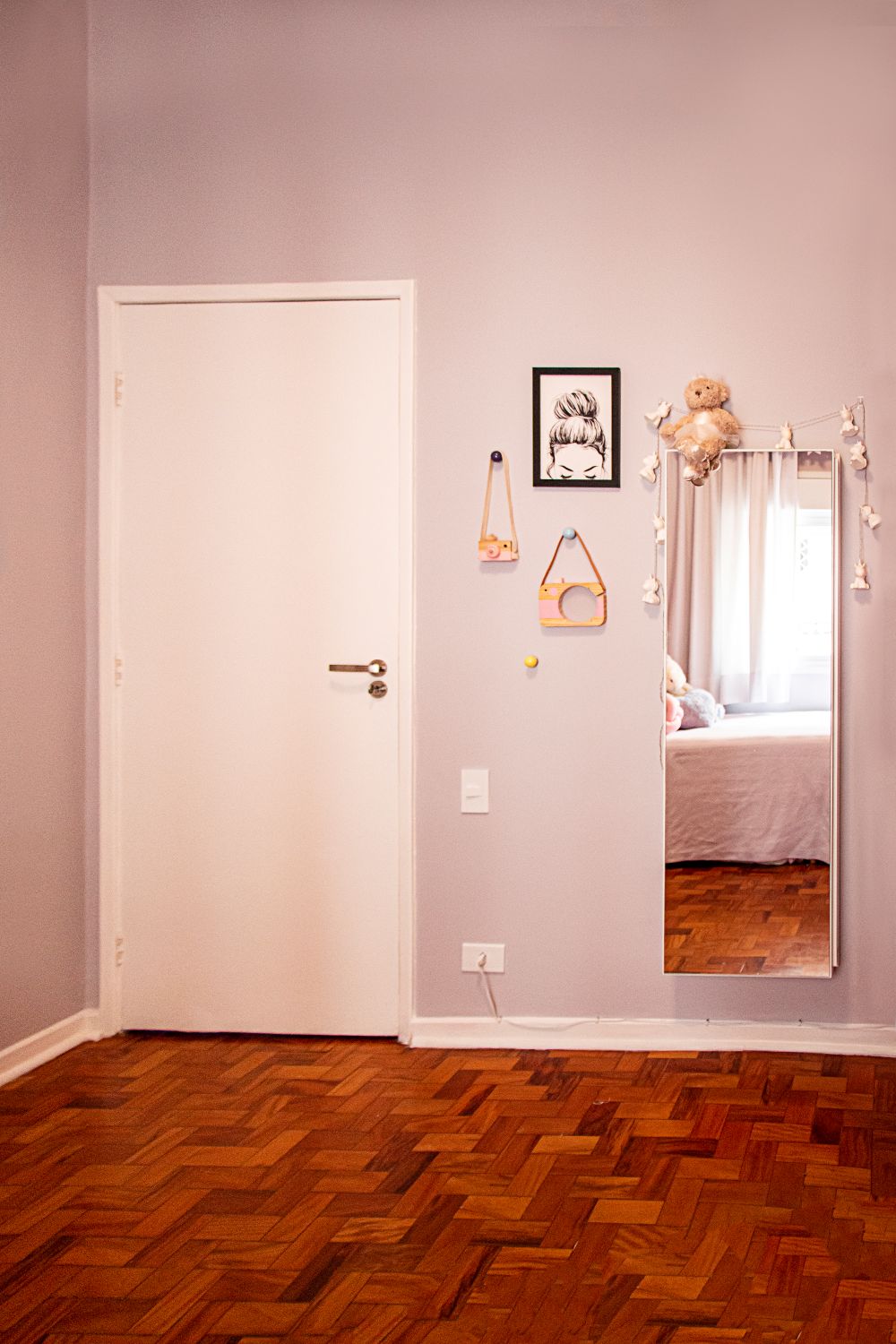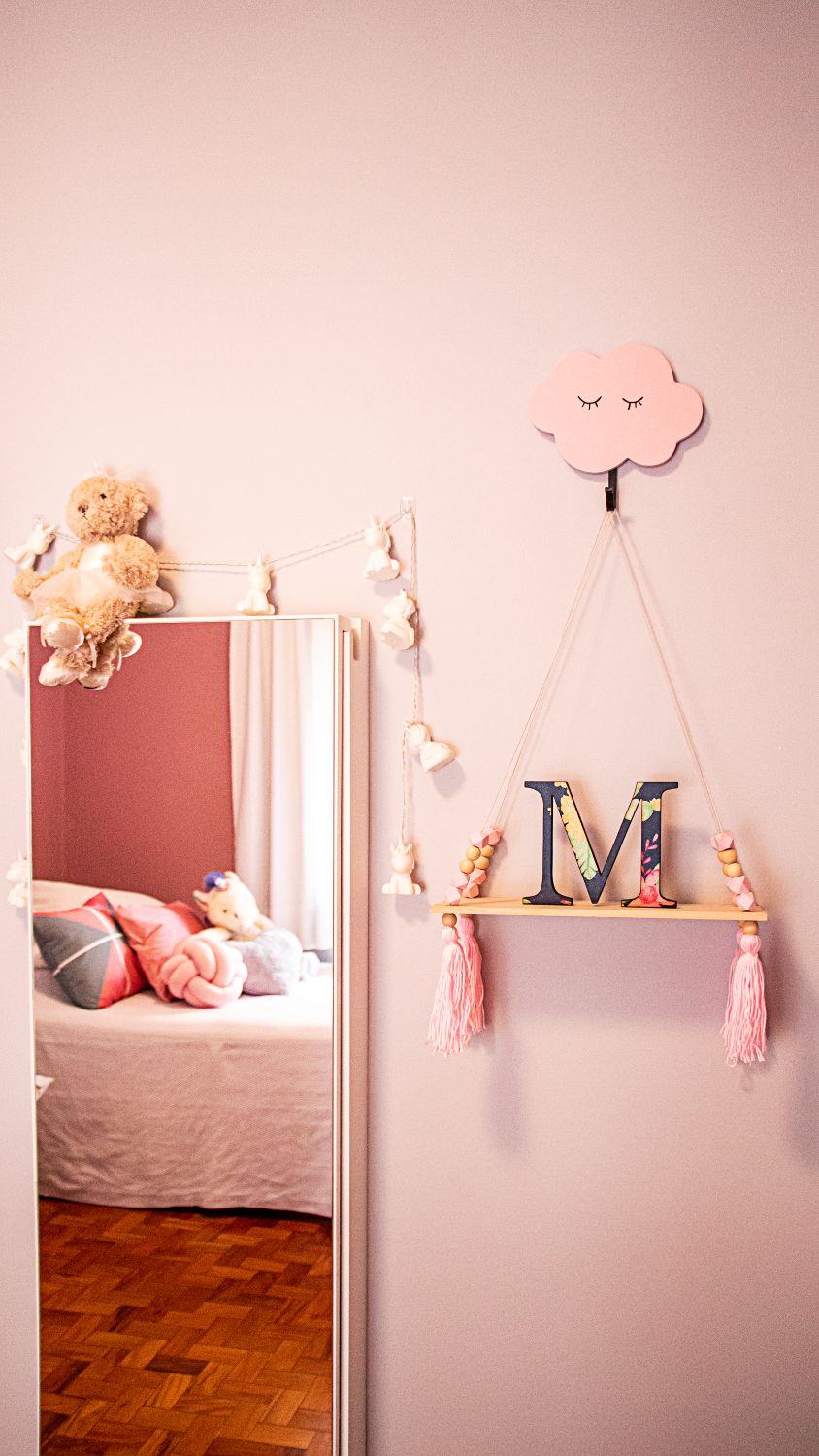 O quarto da menina traz cores claras e uma pintura na parede que substitui a cabeceira tradicional, criando um ambiente leve e delicado.