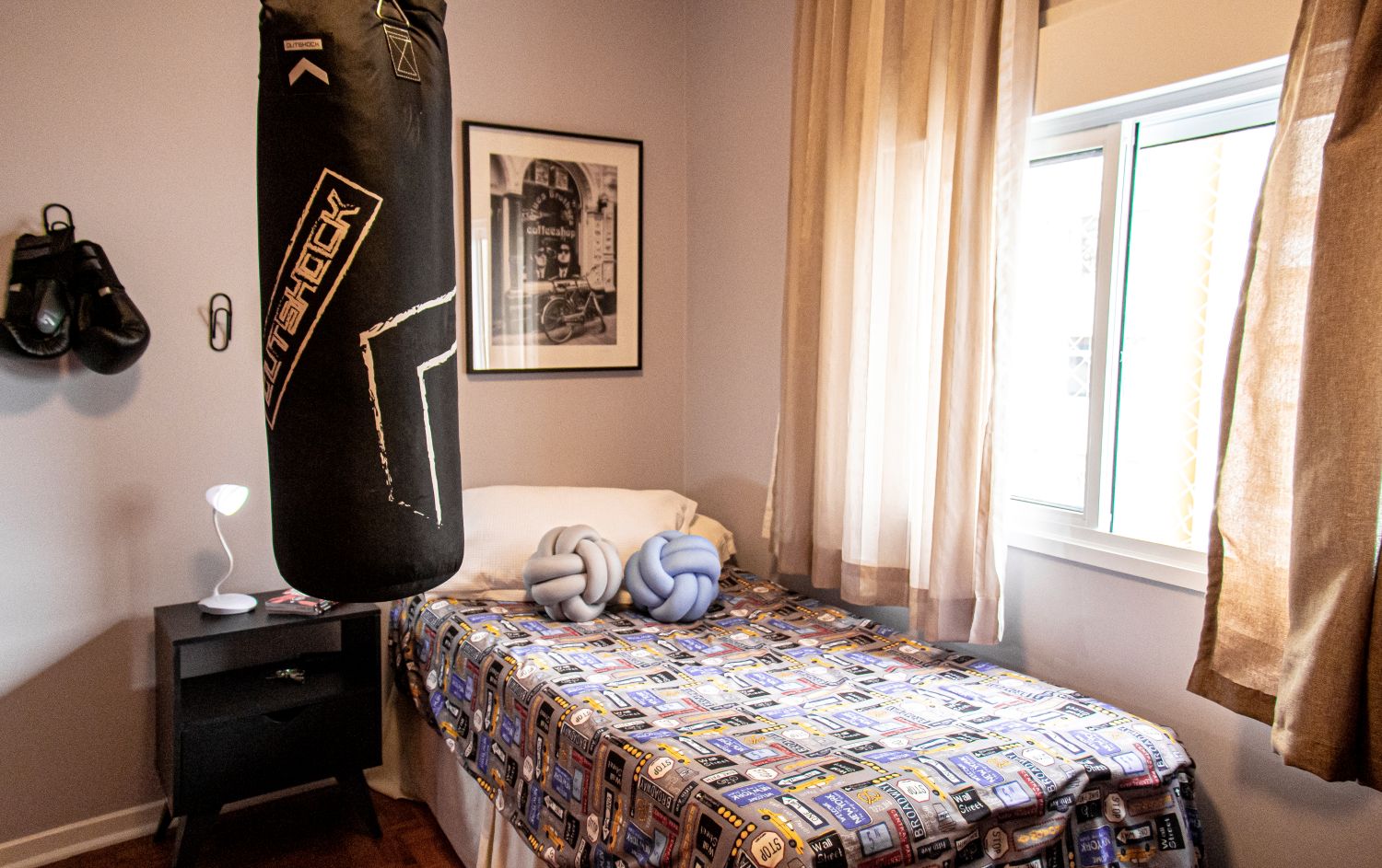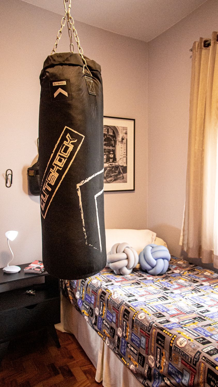 No quarto do garoto, o toque de personalidade aparece com um saco de pancada, unindo diversão e estilo.