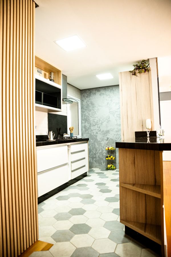 O ponto de partida foi a união dos ambientes — cozinha, sala de estar, espaço de trabalho e a área da churrasqueira — organizados em um fluxo contínuo, sem barreiras, mas aproveitando o piso de madeira que já existia na sala. Assim como em uma colmeia, cada setor se complementa e o piso faz essa setorização de forma delicada e aconchegante, permitindo que cozinhar, trabalhar, receber amigos ou simplesmente relaxar faça parte da mesma experiência.
