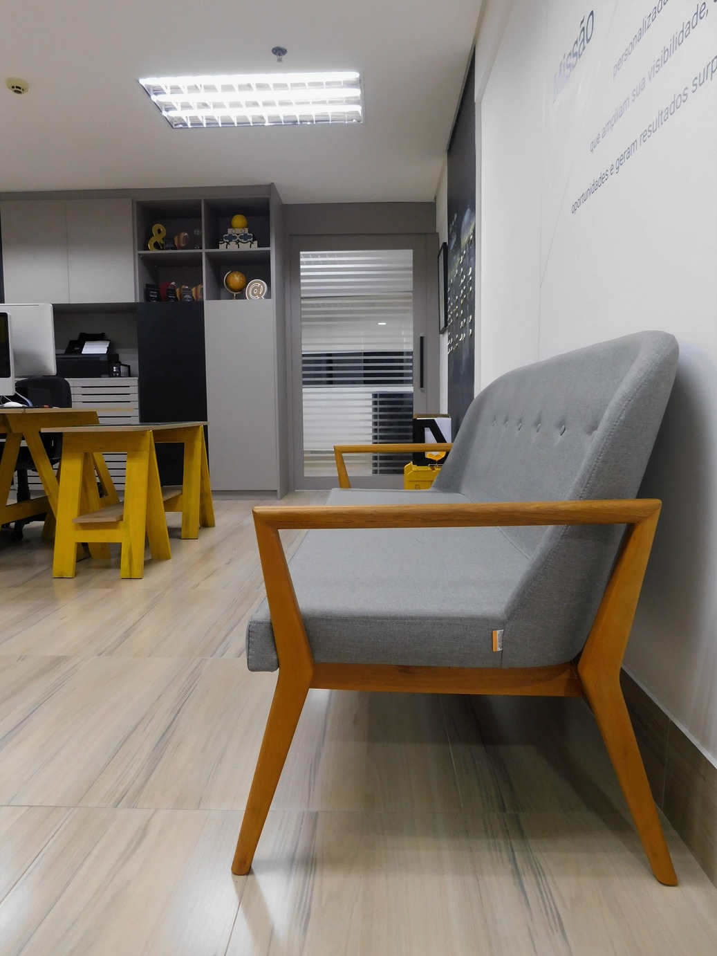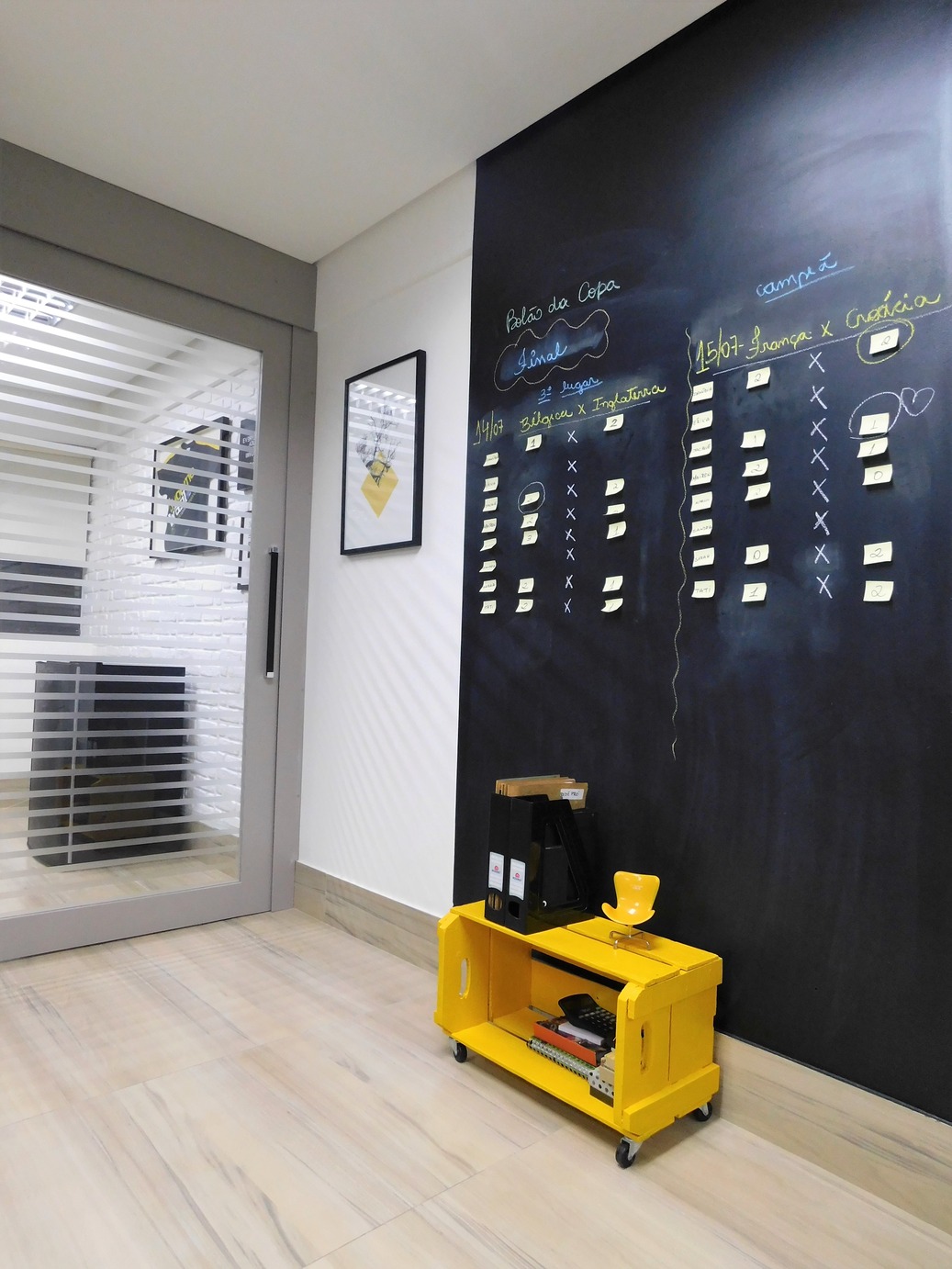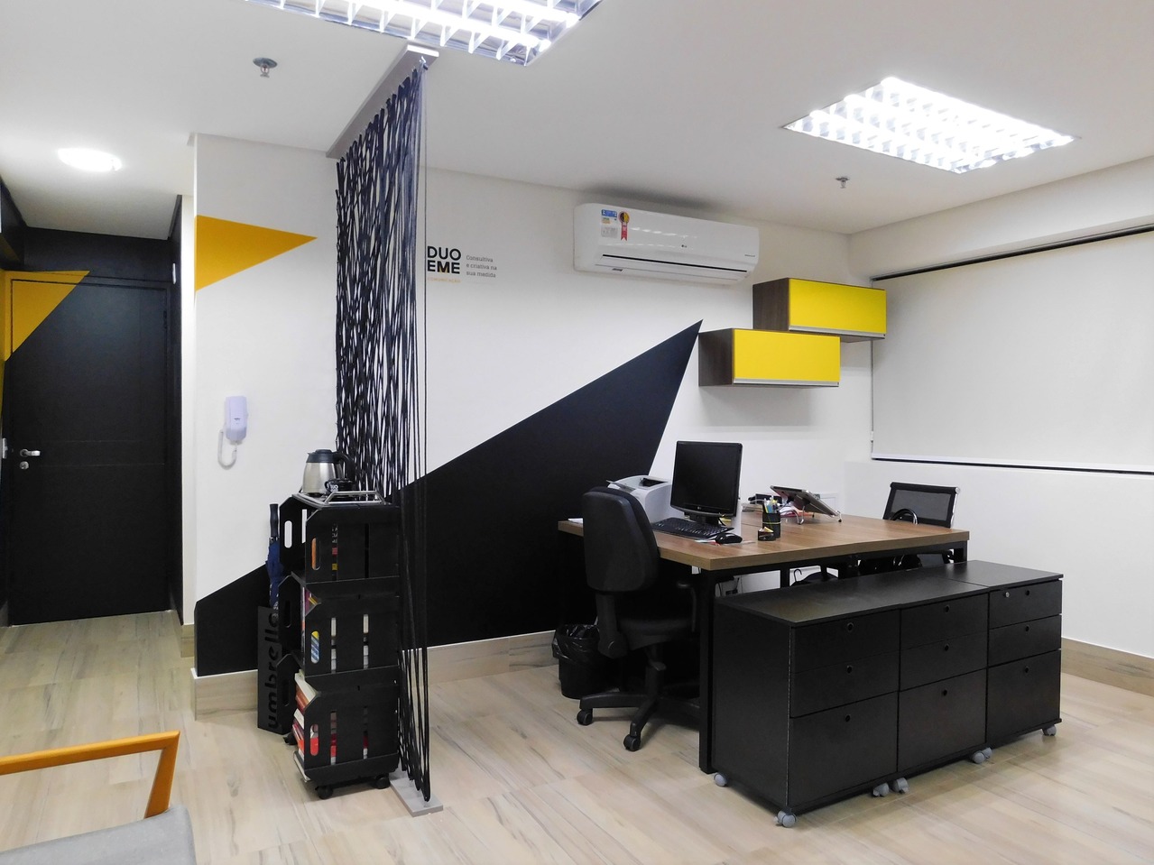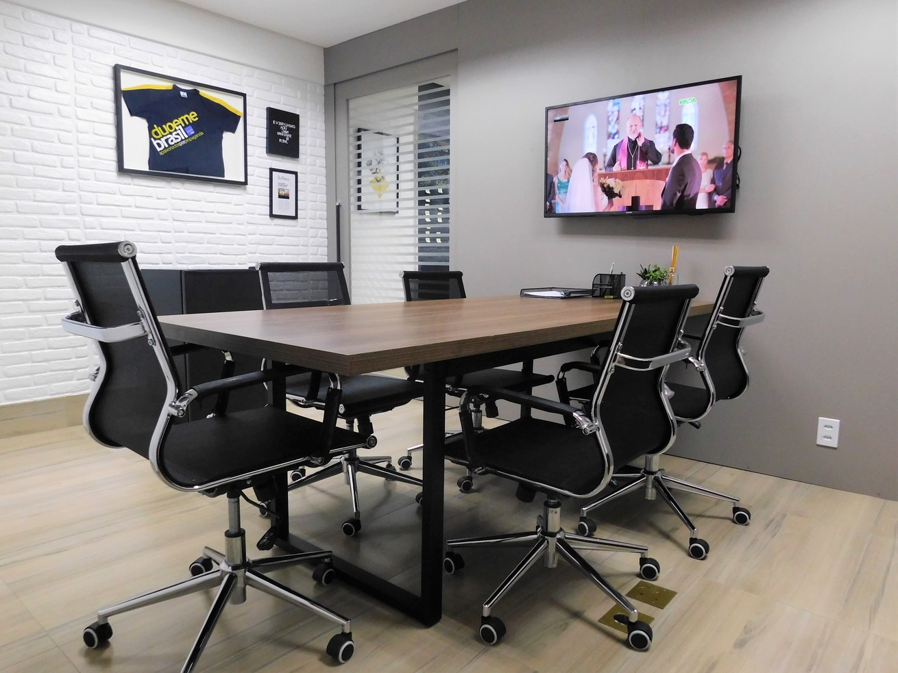 O armário de apoio também ganha dupla função, atuando como divisória para a sala de reunião e otimizando o uso do espaço com inteligência e estilo.