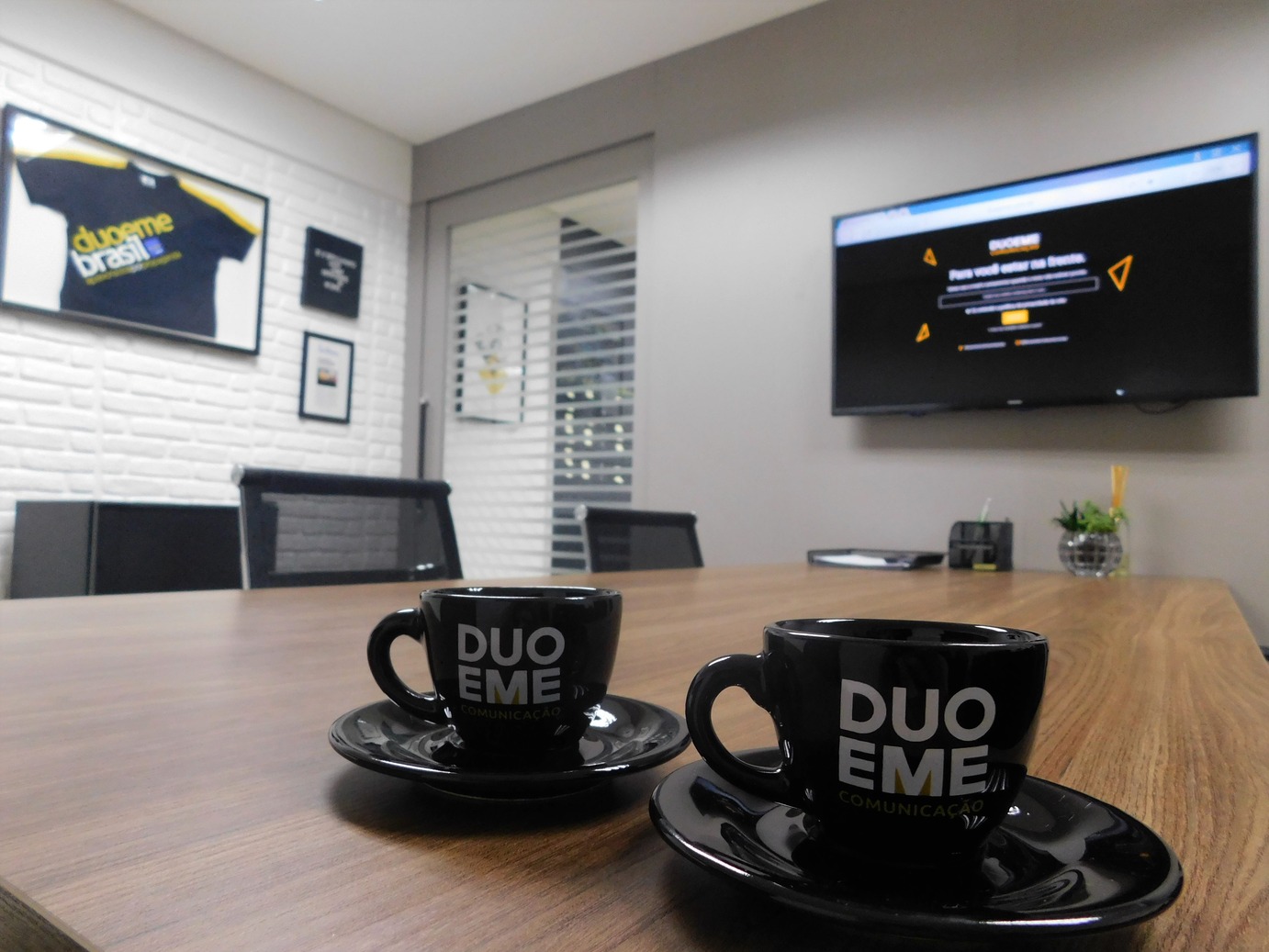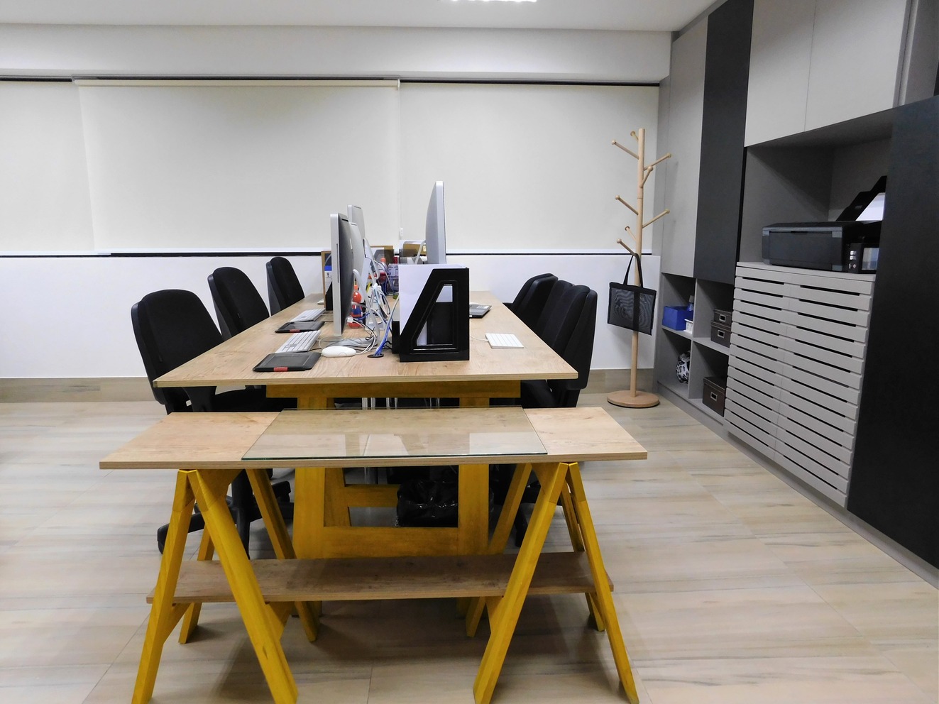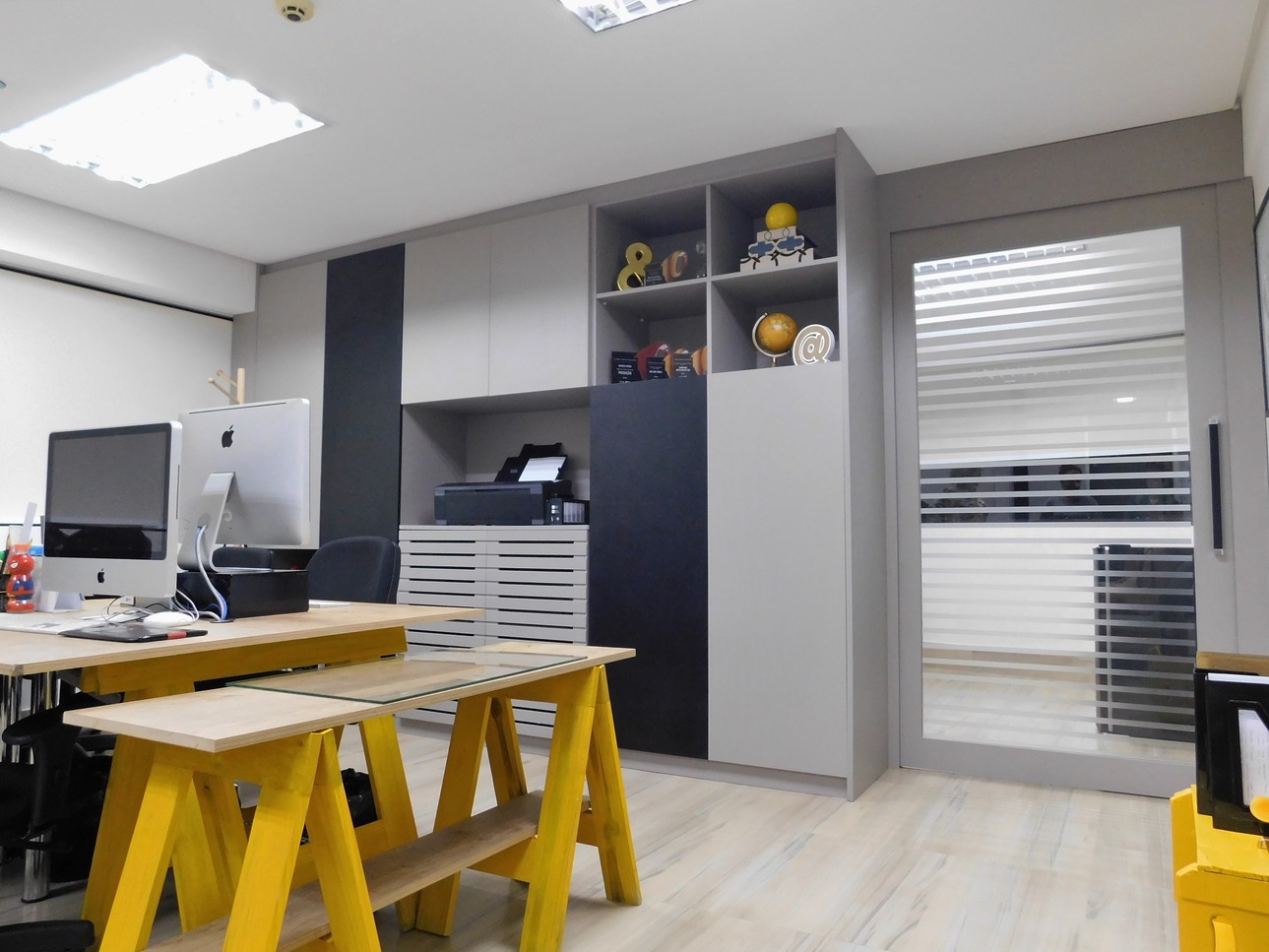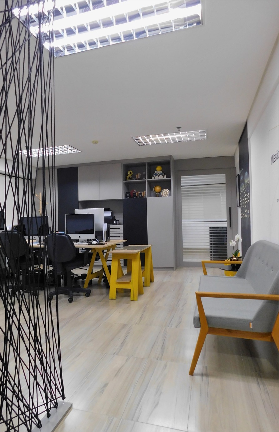 O armário de apoio também ganha dupla função, atuando como divisória para a sala de reunião e otimizando o uso do espaço com inteligência e estilo.