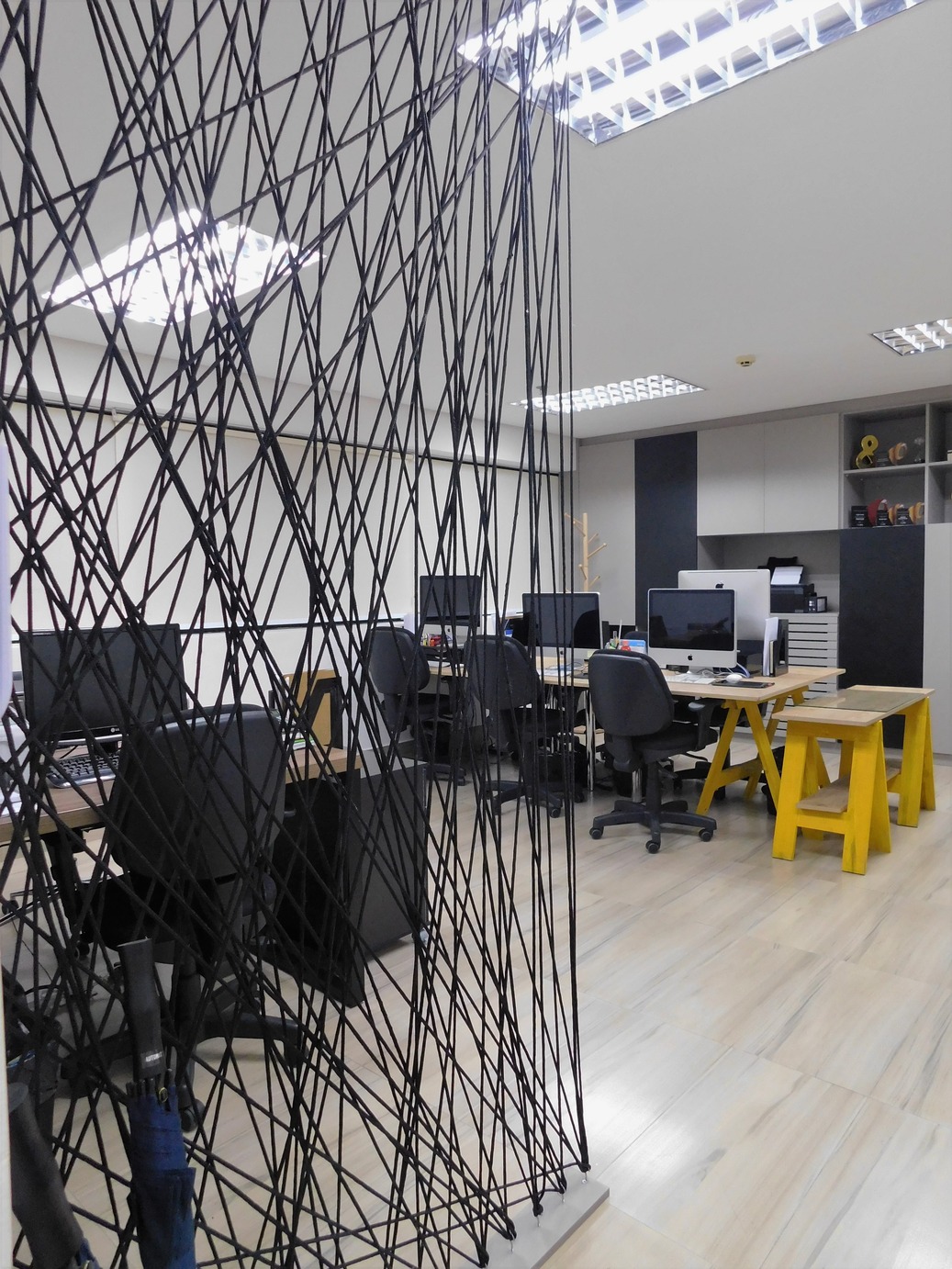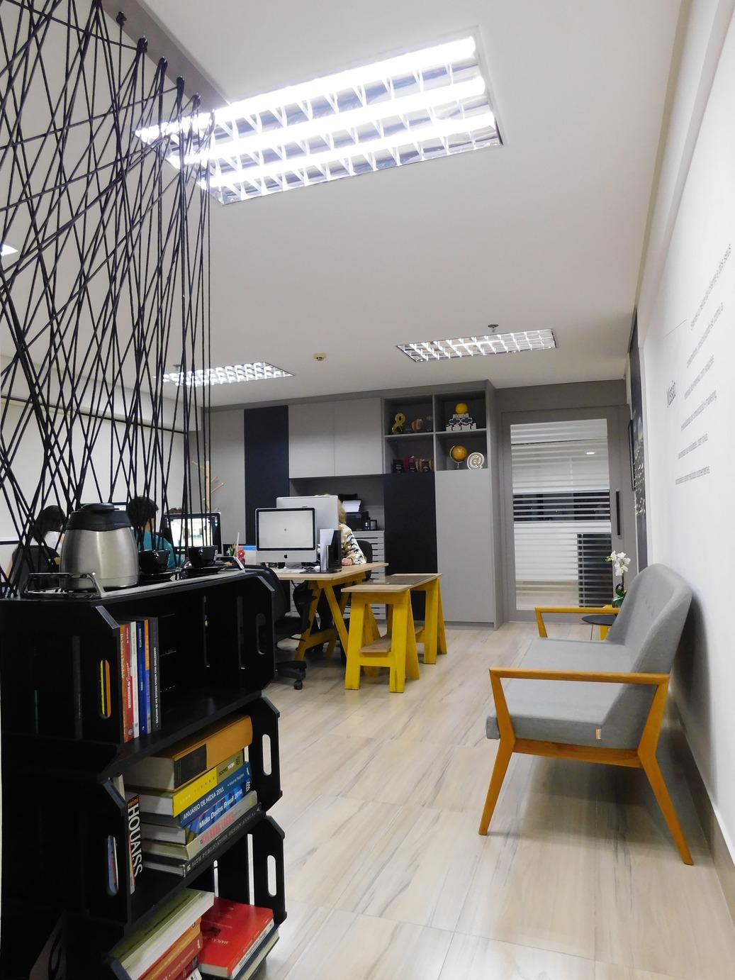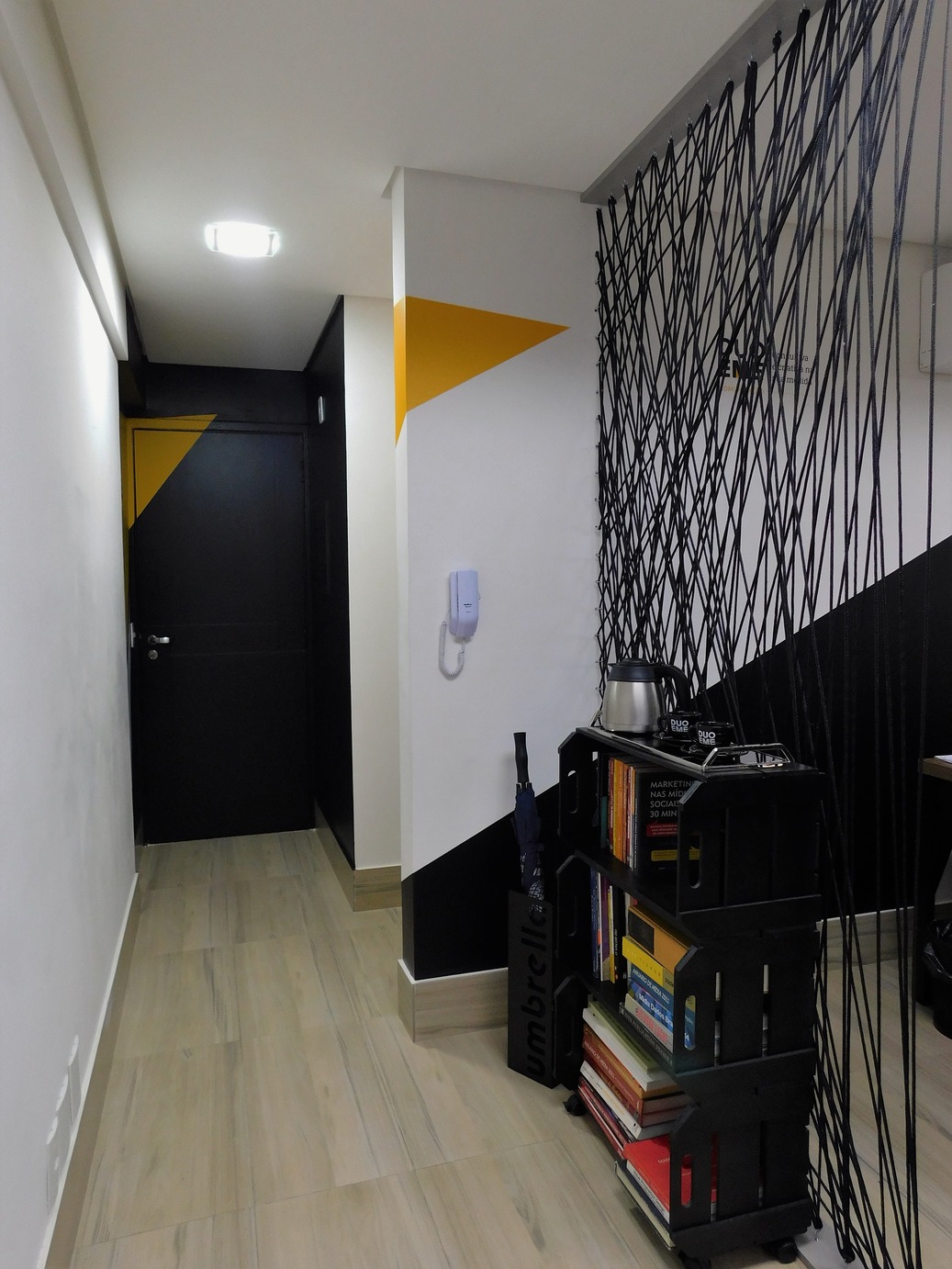 As cores marcantes ajudam a energizar o ambiente e reforçam a identidade visual, enquanto soluções inusitadas, como a divisória em cordas logo na entrada, despertam curiosidade e leveza.