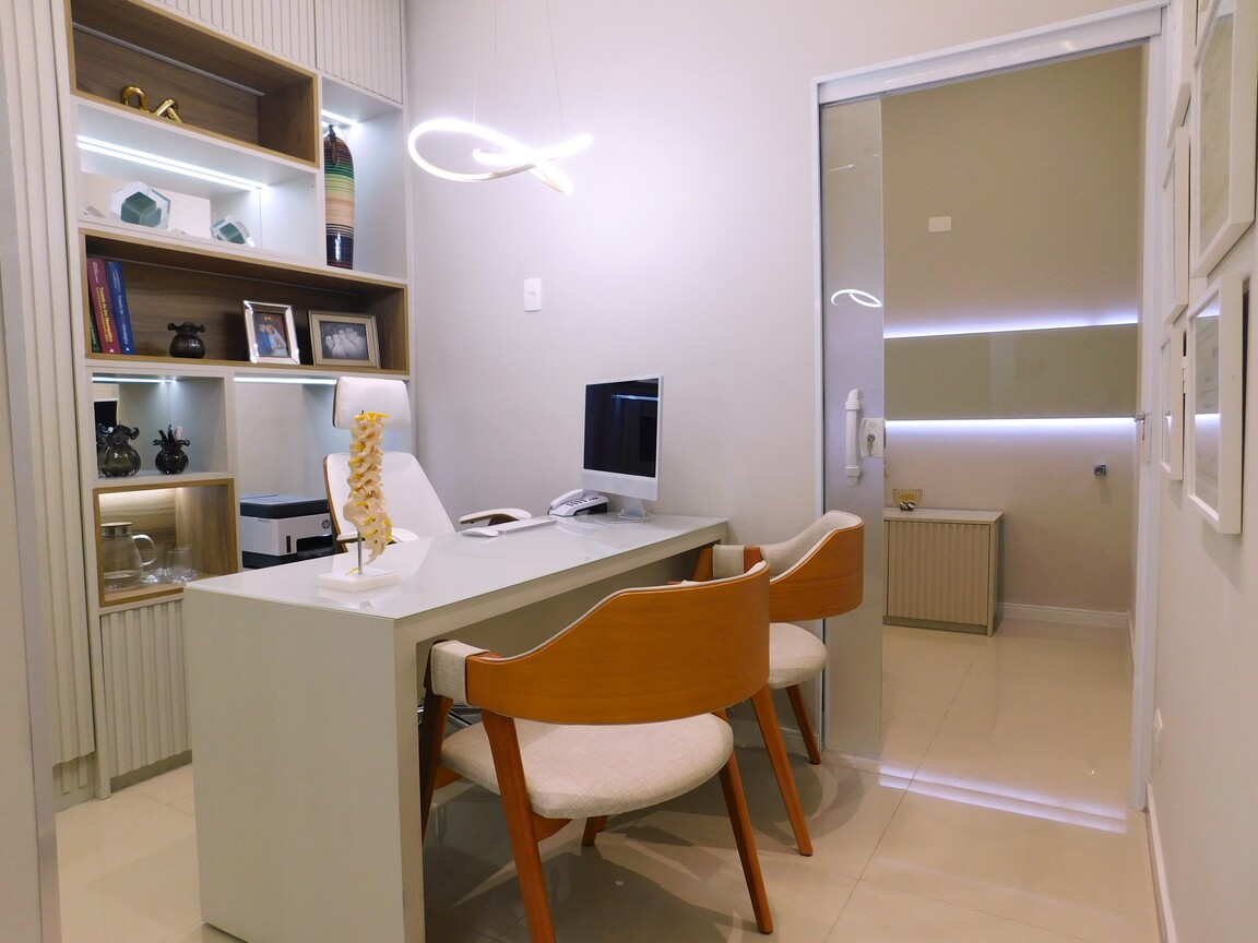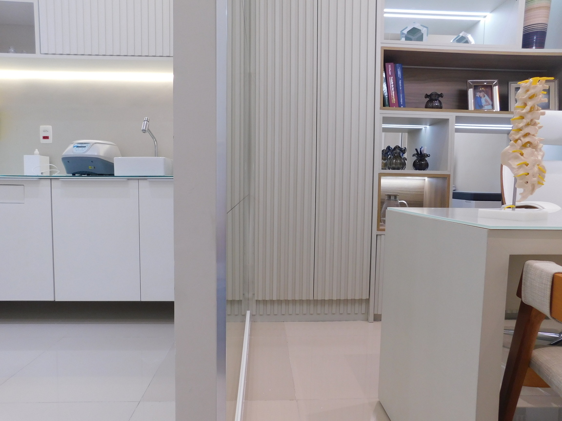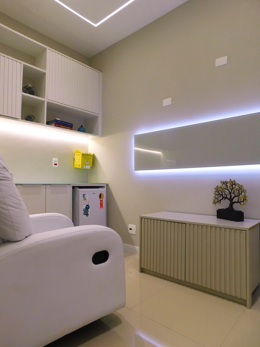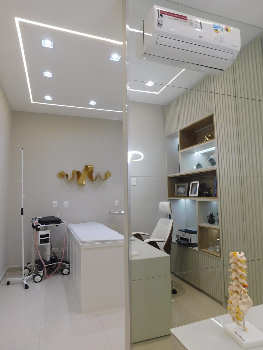 Neste projeto para uma clínica especializada em tratamentos de dor, usamos tons claros e uma iluminação suave para criar uma atmosfera relaxante, que ajuda o paciente a se sentir acolhido antes dos procedimentos.
